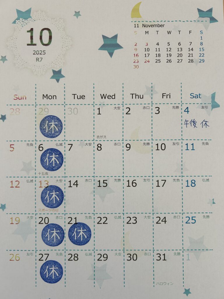 ブログ 10月カレンダー おはこんばんちは。福津市宮司の整骨院、水天一碧です。 ここ数日で急に秋めいてきました。 朝晩の気温差が大きく、体調を崩している方も多いようです。 巷では、彼岸花が見頃を迎えております。